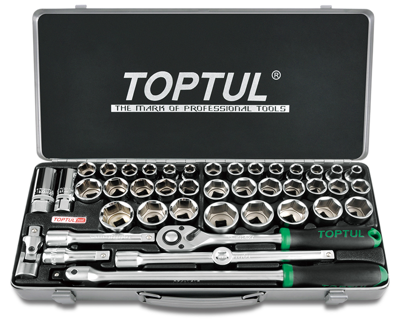 Набор головок и аксессуаров 1/2" 6-гр. 43 предмета (дюйм и метрика) в метал. кейсе TOPTUL